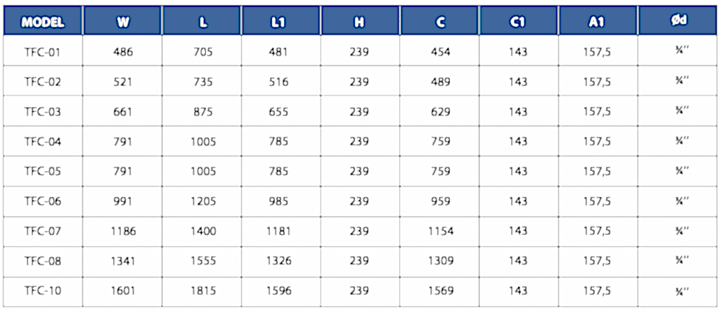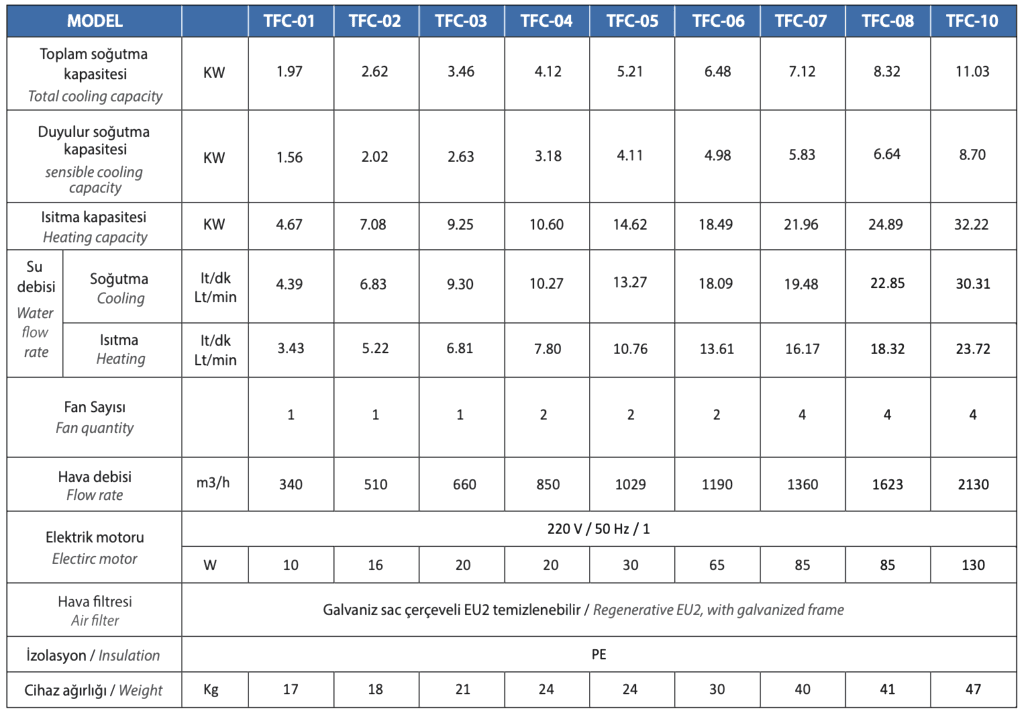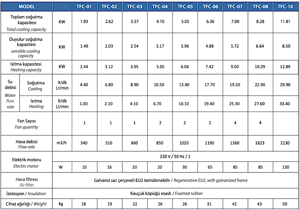TFC serisi fan-coil cihazlarında çift emişli ve öne eğik kanatlı, yüksek verimli, kendinden motorlu sessiz radyal fanlar kullanılmaktadır. Cihaz büyüklüğüne bağlı olarak bir cihazda tek fan-motor grubu veya iki adet fan-motor grubu bulınmaktadır. Motorlar dört hızlıdır.