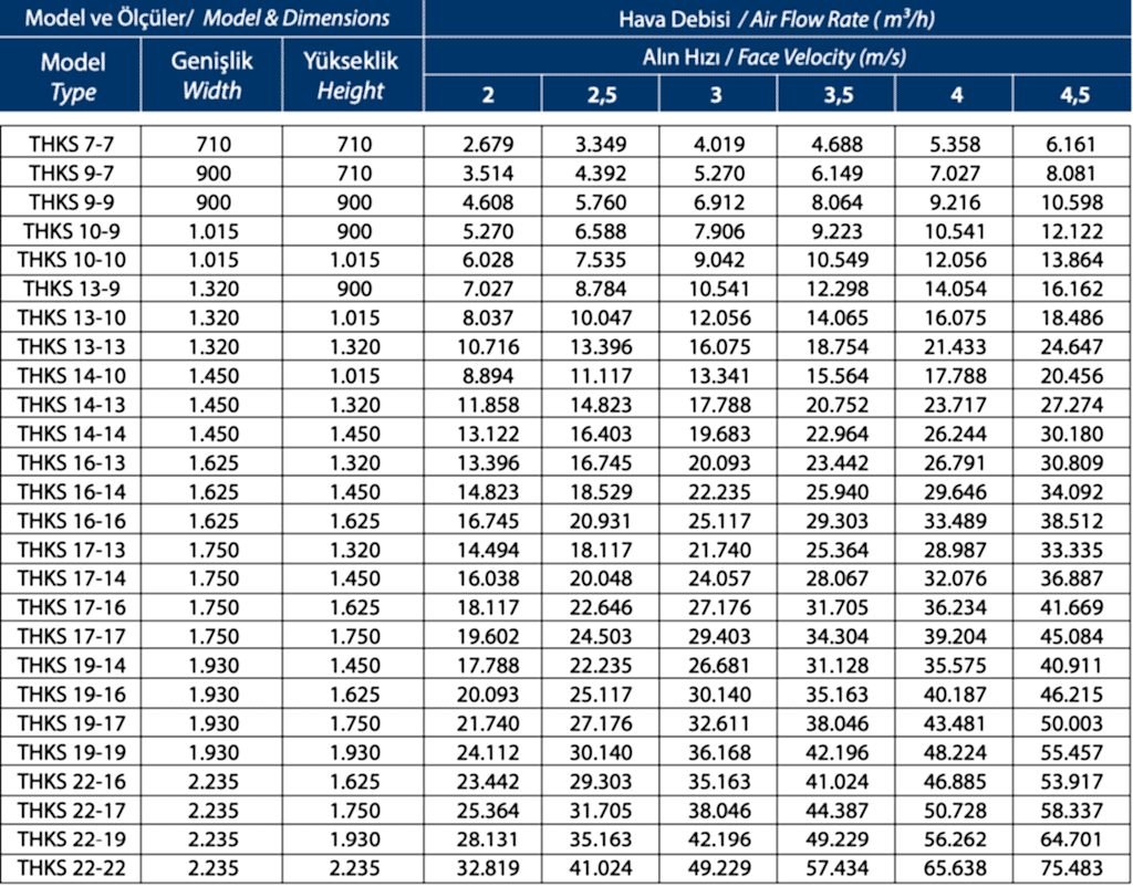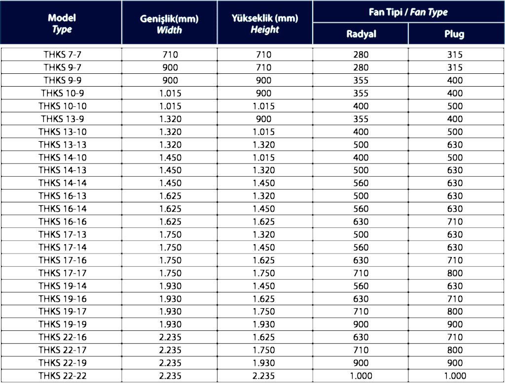 Toplam 26 modelde üretilen THKS tipi santralların hava debileri 1.520 m3/h – 39.200 m3/h arasında değişmektedir. Ancak özel talep üzerine daha büyük debilerde özel tasarım ve üretim gerçekleştirilebilmektedir.