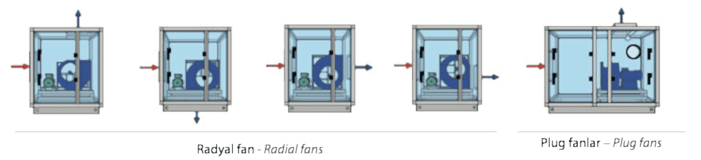 THKS modeli hijyenik santrallerde kolay temizlenebilirliği ve yüzeylerde çok düşük oranlarda toz birikimi olması nedeniyle plug- fanlar kullanılmaktadır. Ancak talep üzerine öne veya geriye eğik kanatlı, çift emişli radyal fanlar da kullanılabilmektedir.