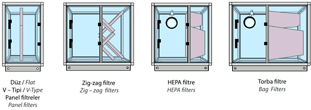 Hijyenik klima santrallerınde filtrelerin yerleştirilişi, klasik klima santrallerine nazaran farklılık arz etmektedir. Klasik santrallerde tek veya çift kademe olan filtreler genelde vantilatörün emiş tarafına bütün elemanlardan önce yerleştirilmektedir. Halbuki THKS modeli hijyenik klima santrallerınde DIN 1946-4’ün gereği olarak kaba filtre olarak tarif edebileceğimiz G3 ve G4 sınıfı (eski EU-3 ve EU-4) filtreler vantilatörün emiş tarafina ve hemen hava girişinden sonra yerleştirilmektedir. F6 ila F9 sınıfı hassas torba filtreler ve kompakt filtreler ise (eski EU-6 ila EU-9) vantilatörün basma tarafina, deflektörlü bir hücreden sonra yerleştirilmektedir. Bu arada H13, H14 sinifi HEPA filtrelerden de bahsetmek gerekir. Temiz oda teknolojisinde bu filtreler hizmet verdiği mahalin içine, üfleme terminal elemanından hemen önce yerleştirilmektedirler. Bu nedenle klima santralı içine yerleştirilmezler. Ancak özel talep durumunda, üretilen özel filtre kabinleri vasıtasıyla bu filtrelerin de santral içine genelikle, torba filtrelerden hemen sonra yerleştirilmeleri mümkündür.