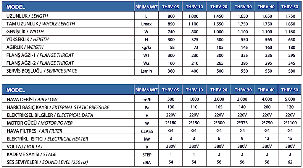 THRV serisi ısı geri kazanım cihazları 1000m3/h ile 5000m3/h hava debisi arasında yer alan 6 farklı debideki modelden oluşmaktadır.Cihazlar Avrupa Birliği direktiflerine uygun olarak üretilmiş olup, CE etiketlemesine sahiptir.